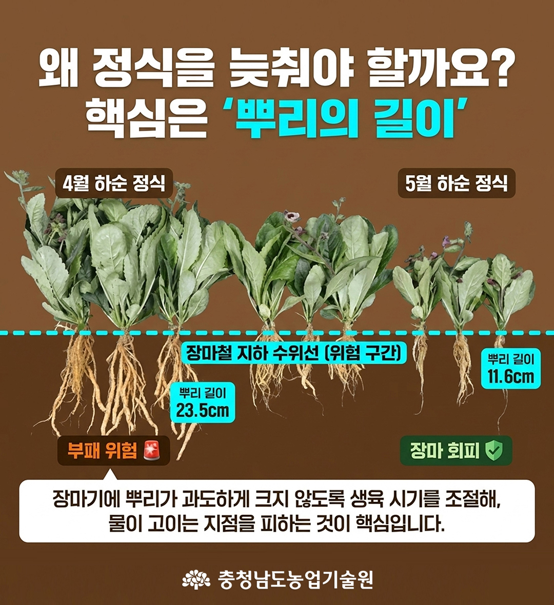 뿌리 길이 조절: 5월 하순에 심으면 장마철에 뿌리가 과도하게 길어지는 것을 방지합니다.